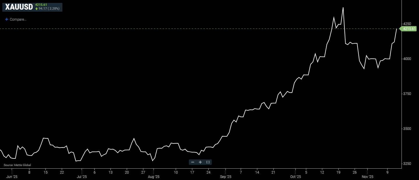 Spot gold was up 2.28% at $4,215.61 an ounce as of [12:44 pm] PST, according to data reported by Mettis Global.