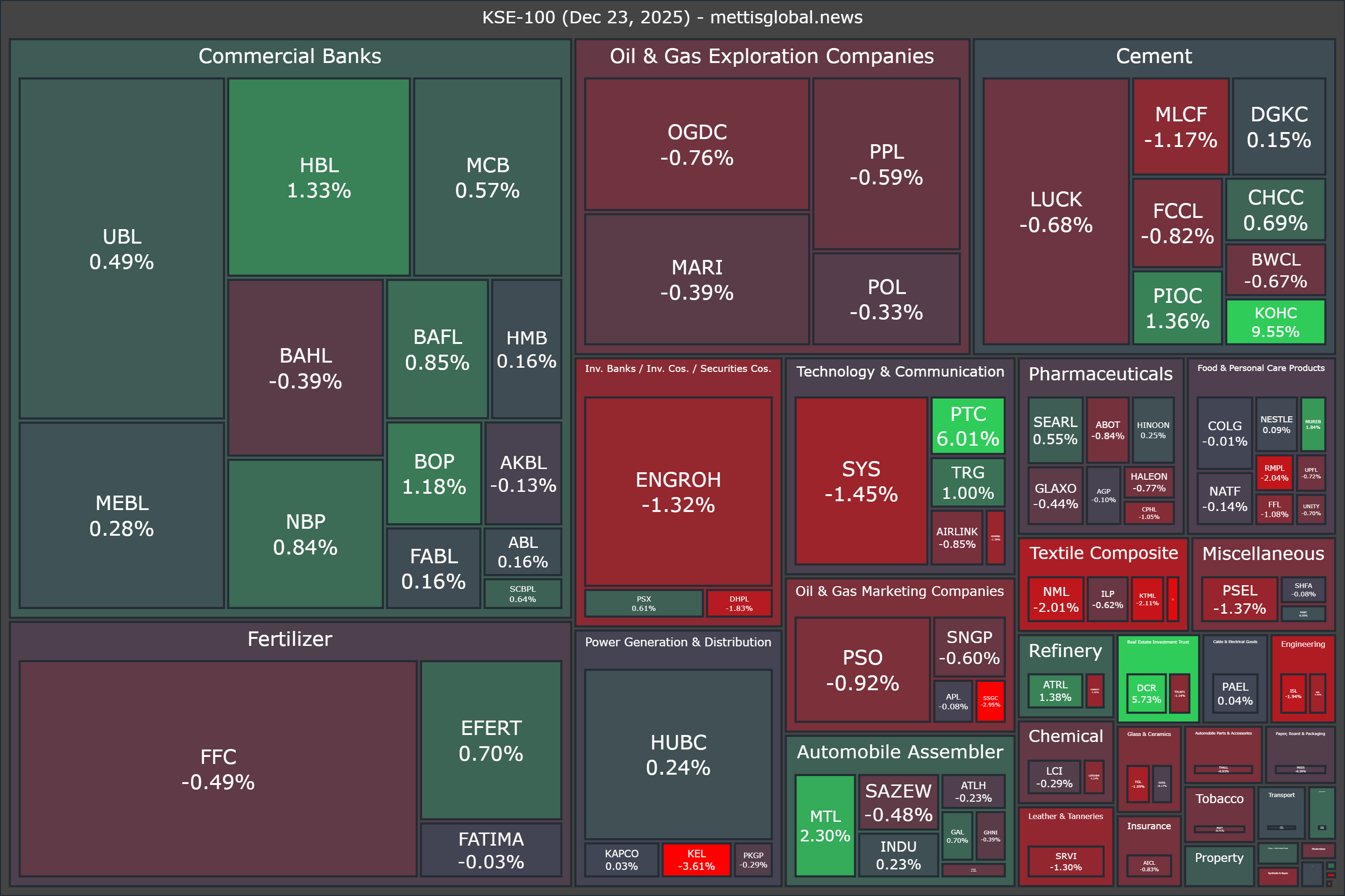 In terms of index-point contributions, companies that dragged the index lower were ENGROH (-100.07pts), FFC (-82.59pts), SYS (-72.67pts), LUCK (-52.39pts), and OGDC (-44.60pts).