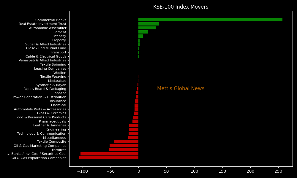 Sector-wise, KSE-100 Index was let down by Oil & Gas Exploration Companies (-105.61pts), Inv. Banks / Inv. Cos. / Securities Cos. (-103.51pts), Fertilizer (-51.91pts), Oil & Gas Marketing Companies (-51.29pts), and Textile Composite (-43.98pts).