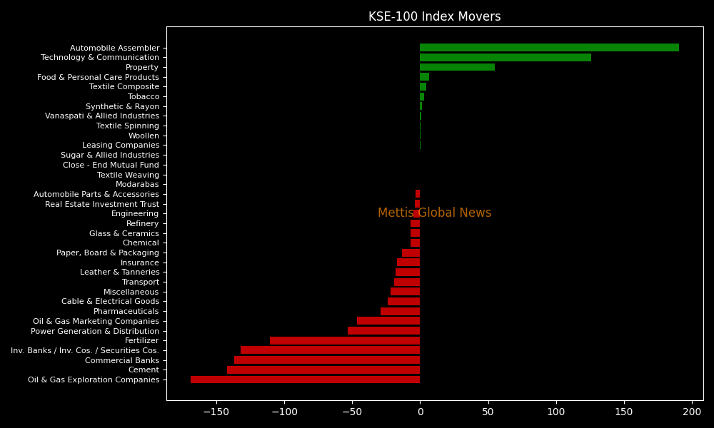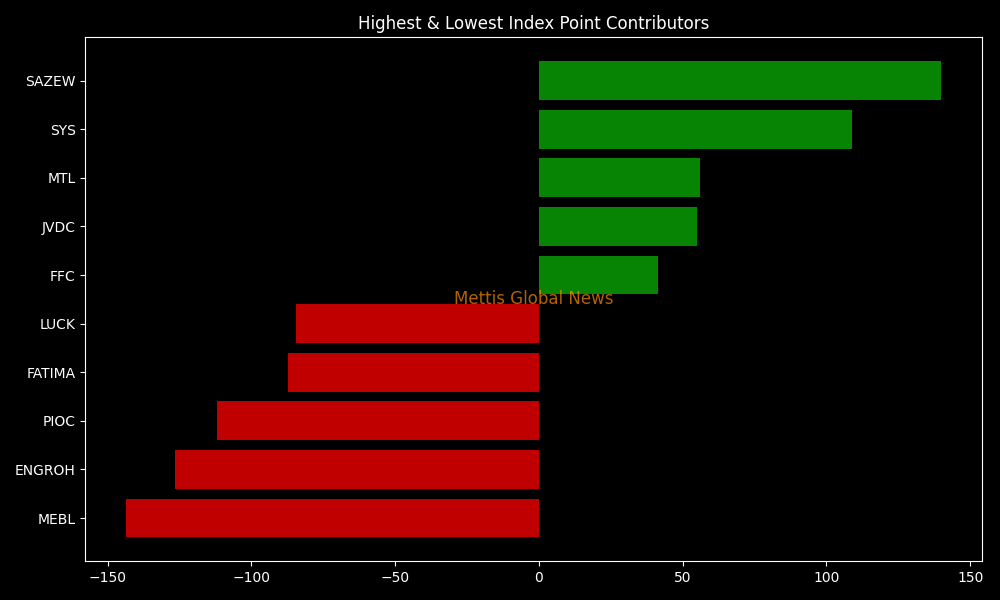In terms of index-point contributions, companies that dragged the index lower were MEBL (-143.55pts), ENGROH (-126.55pts), PIOC (-111.88pts), FATIMA (-87.23pts), and LUCK (-84.51pts).