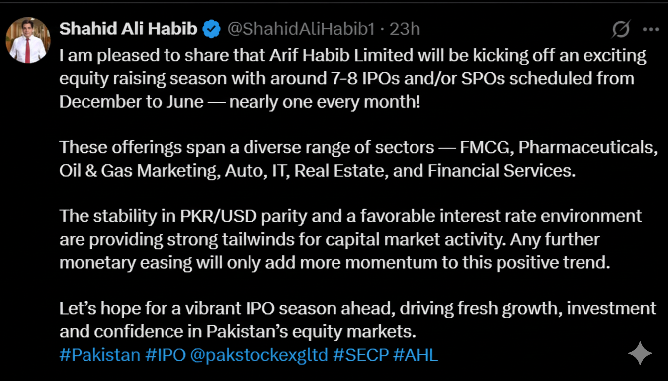 November 10, 2025 (MLN): Pakistan’s leading brokerage and investment banking firm, Arif Habib Limited (AHL), is set to kick off what could be one of the most active equity raising seasons in recent years, with around seven to eight Initial and Secondary Public Offerings (IPOs/SPOs) lined up between December and June.
