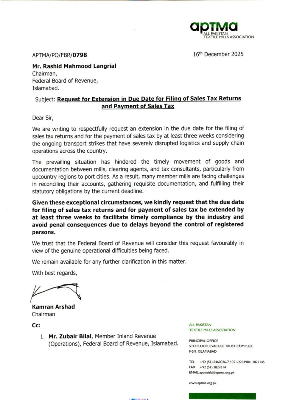 December 16, 2025 (MLN): The All Pakistan Textile Mills Association (APTMA) has formally requested the Federal Board of Revenue (FBR) to grant an extension of at least three weeks for the filing of sales tax returns and the payment of sales tax.