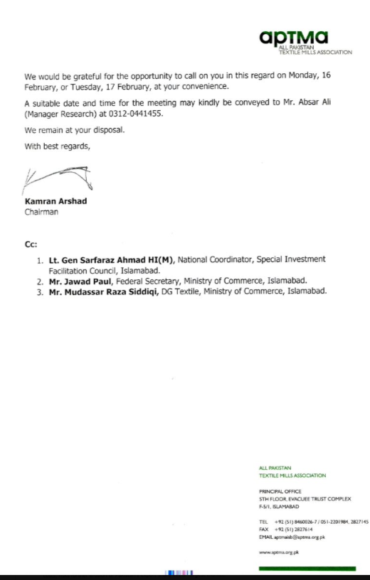 APTMA has now urged the Government of Pakistan to formally