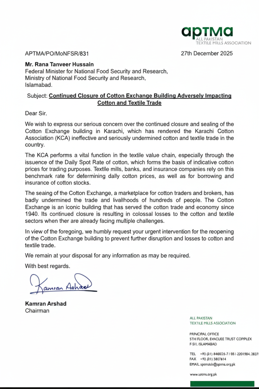 December 29, 2025 (MLN): The All Pakistan Textile Mills Association (APTMA) has expressed serious concern over the continued closure and sealing of the Cotton Exchange building in Karachi, warning that the move is severely disrupting the country’s cotton and textile trade.