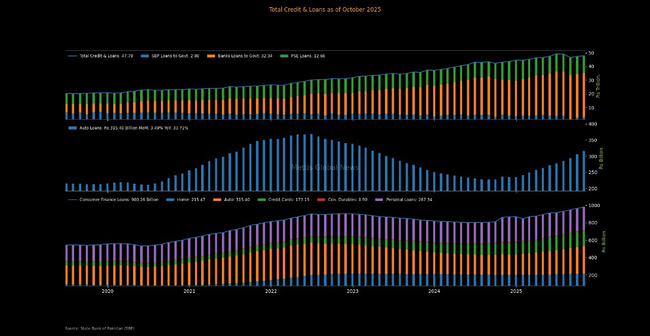 November 17, 2025 (MLN): Automobile financing in Pakistan has increased to Rs315.4bn in October 2025, witnessing a rise of 3.49% MoM compared to Rs304.77bn recorded in September 2025, according to the latest data released by the central bank.