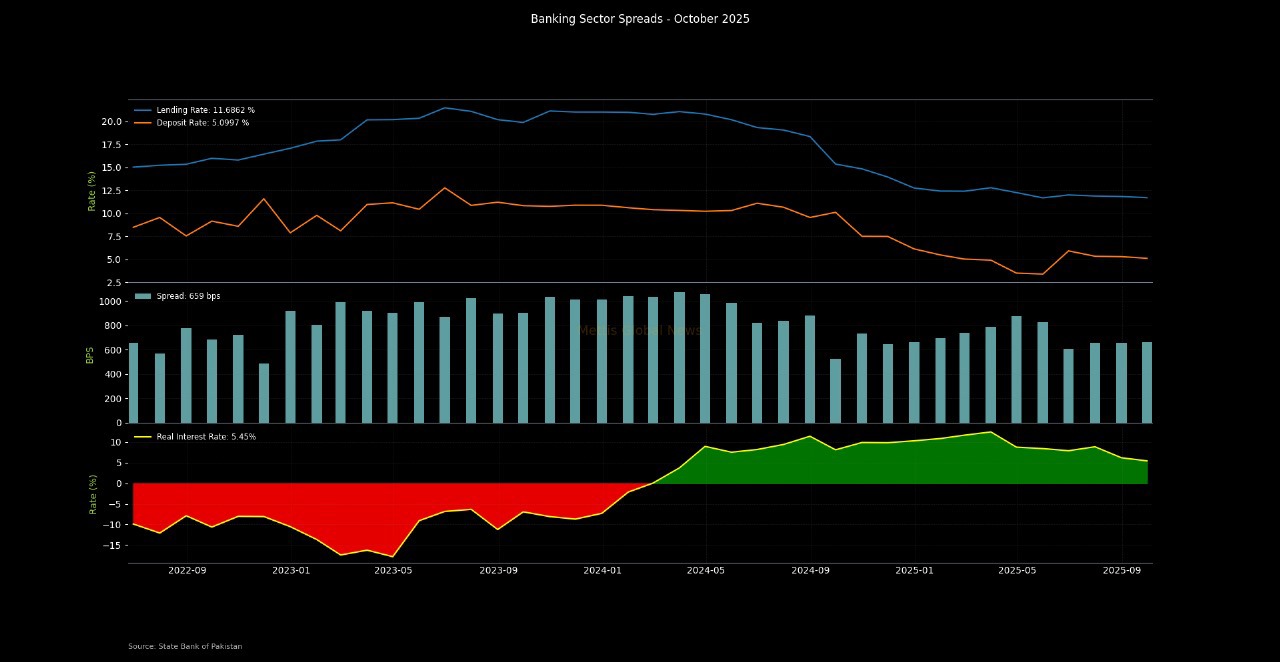 Accordingly, the banking sector spread increased by 5bps to 659bps in October 2025 compared to a spread of 654bps last month.