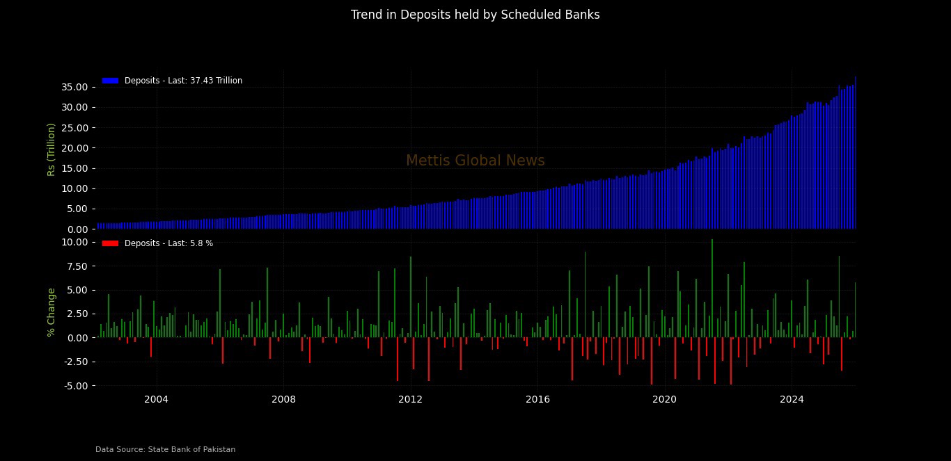 January 28, 2026 (MLN): The total deposits held by scheduled banks have moved up by 5.8% to Rs37.43 trillion in December compared to Rs35.38tr by the end of last month.