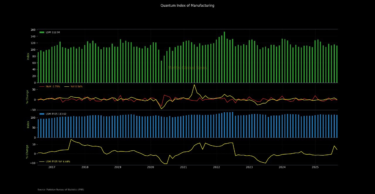 October 17, 2025 (MLN): Pakistan’s Large-Scale Manufacturing Index (LSMI) posted a 4.44% YoY growth during July–August FY26 to stand at 113.62, compared to 108.79 in the same period last year, according to provisional data released by the Pakistan Bureau of Statistics (PBS).