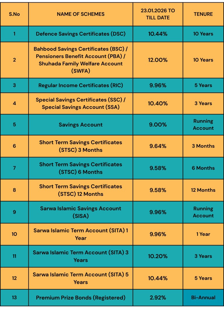January 24, 2026 (MLN): The Central Directorate of National Savings (CDNS) has revised profit rates on various savings schemes, effective January 23, 2026, adjusting returns across both conventional and Islamic instruments in line with the prevailing market and monetary conditions.