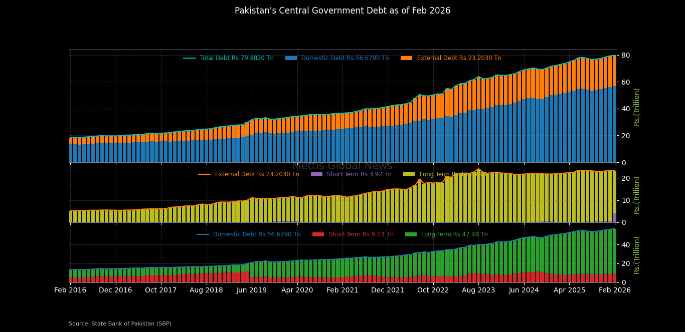 April 08, 2026 (MLN): The total debt of the central government went up by 9.37% YoY to Rs79.88 trillion in February 2026, compared to Rs73.04tr in February 2025, the data released by the State Bank of Pakistan (SBP) showed.