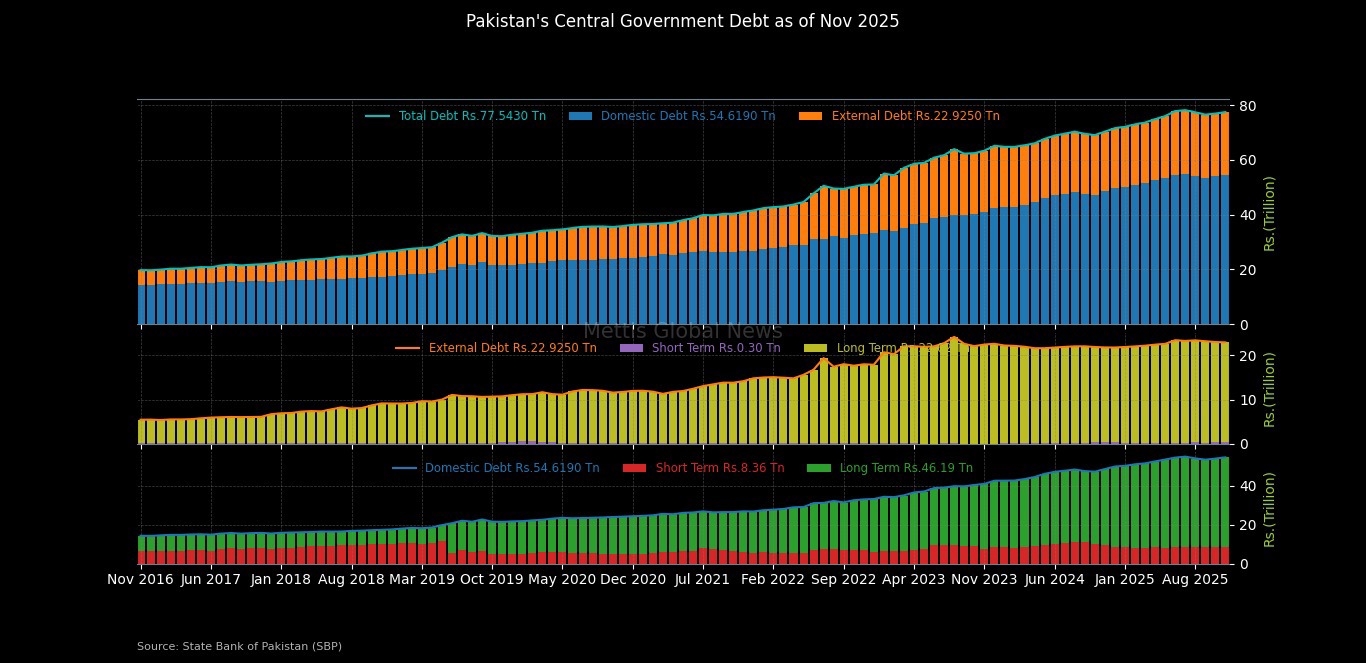 January 06, 2026 (MLN): The total debt of the central government went up by 10.2% YoY to Rs77.54 trillion in November 2025, compared to Rs70.37tr in November 2024, the data released by the State Bank of Pakistan (SBP) showed.