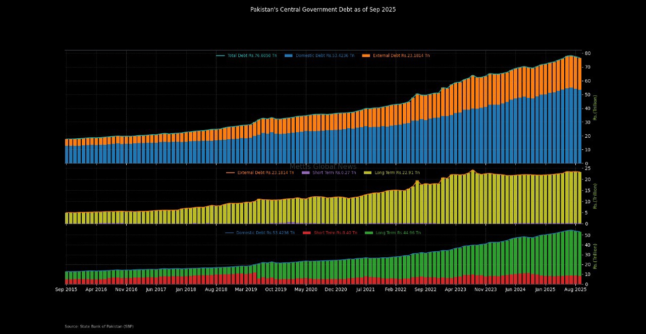 November 14, 2025 (MLN): The total debt of the central government increased by 10.11% YoY to Rs76.61 trillion in September 2025, compared to Rs69.57tr in September 2024, the data released by the State Bank of Pakistan (SBP) showed.