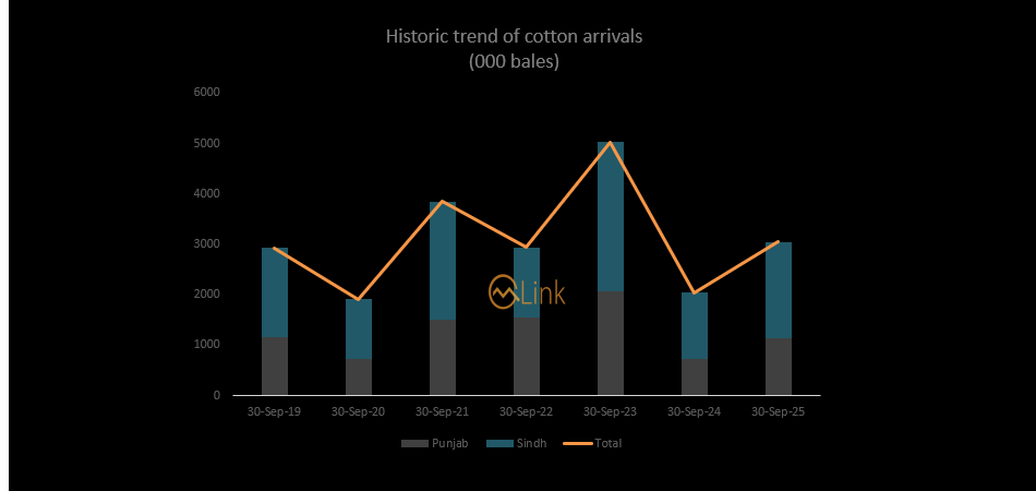 October 03, 2025 (MLN): Cotton arrivals in Pakistan surged significantly, crossing the three-million-bale mark by September 30, 2025, showing a strong recovery in production.