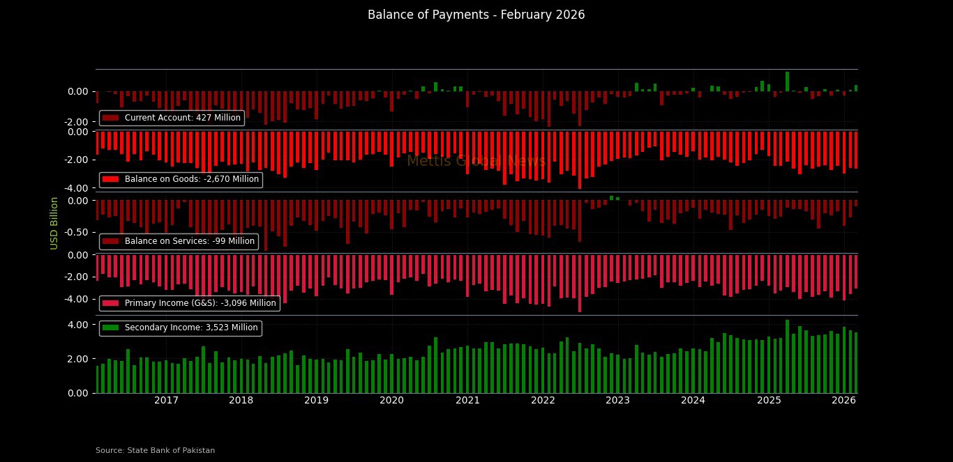 March 16, 2026 (MLN): Pakistan recorded a current account surplus of $427 million in February, according to the latest data released by the State Bank of Pakistan (SBP).