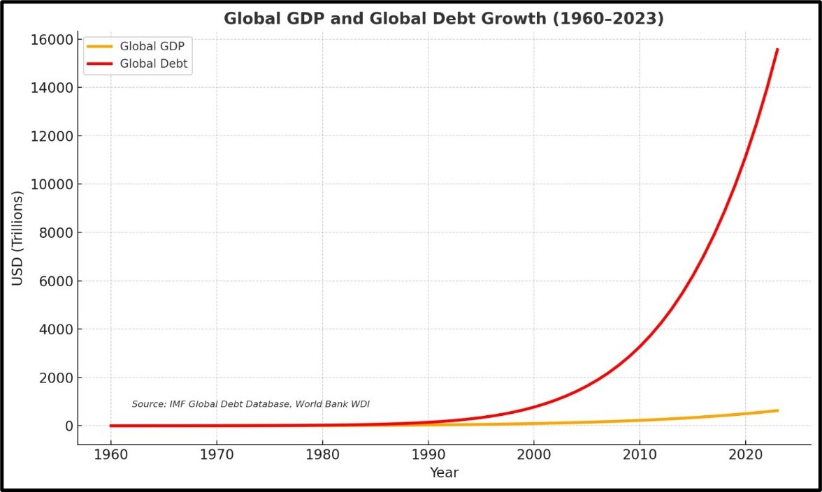 The second chart deepens the picture. Here, global GDP and global debt move together, almost indistinguishably, until around 1990. After that, the curves diverge. Growth slowed, but debt kept rising.