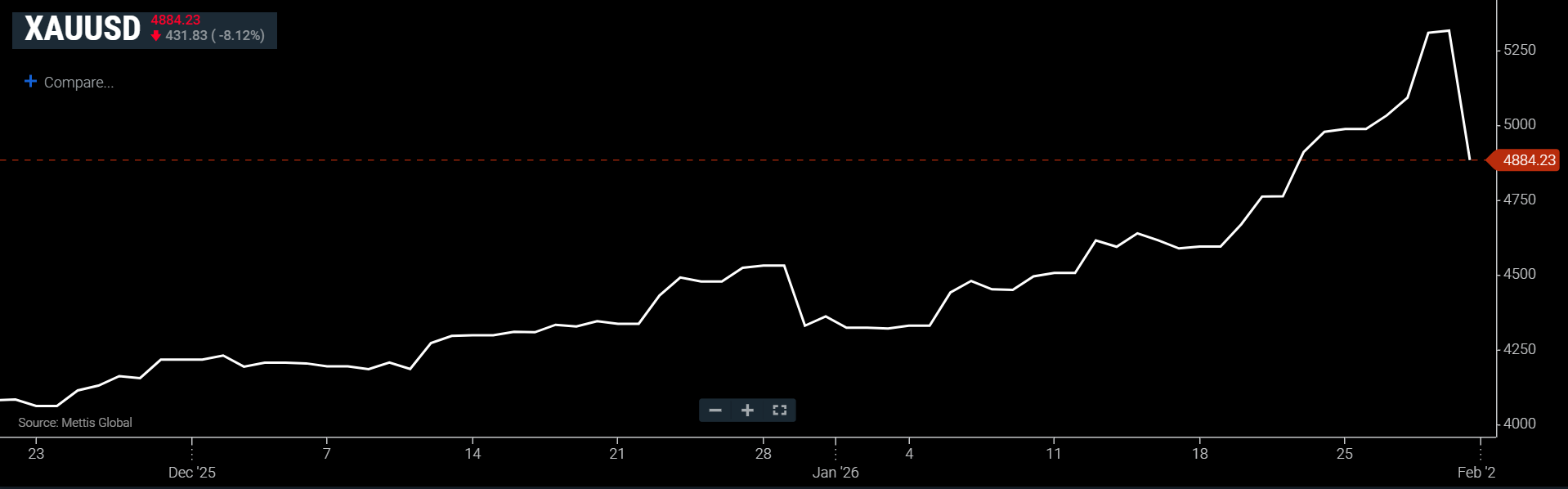 Gold was also not spared from the rout, as Spot gold fell 8.12% to $4,884.23 an ounce as of [1:09 PM] PST, according to data reported by Mettis Global.