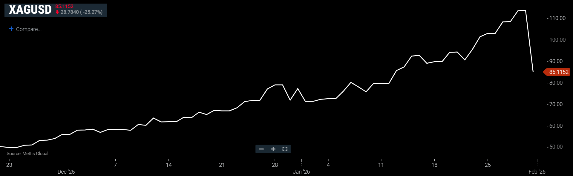 Silver recorded some of the steepest losses, as Spot Silver fell 25.27% to $85.11 an ounce as of [1:09 PM] PST, according to data reported by Mettis Global.