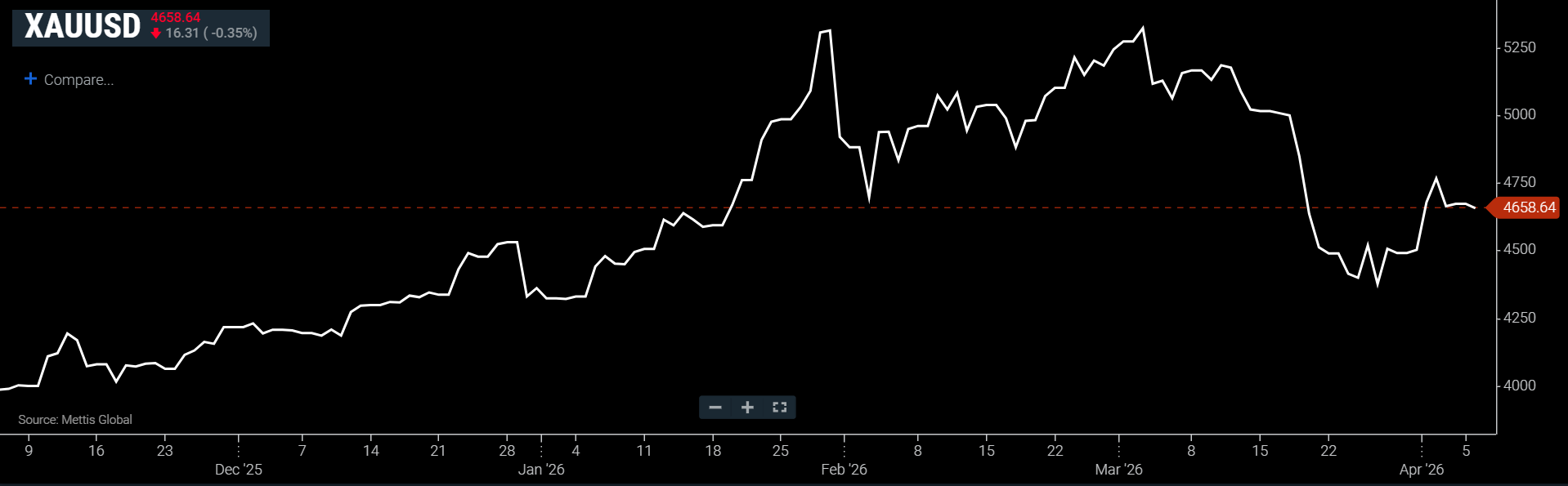Currently, spot gold is down 0.35% to $4,658.64 an ounce as of [9:28 am] PST, according to data reported by Mettis Global.
