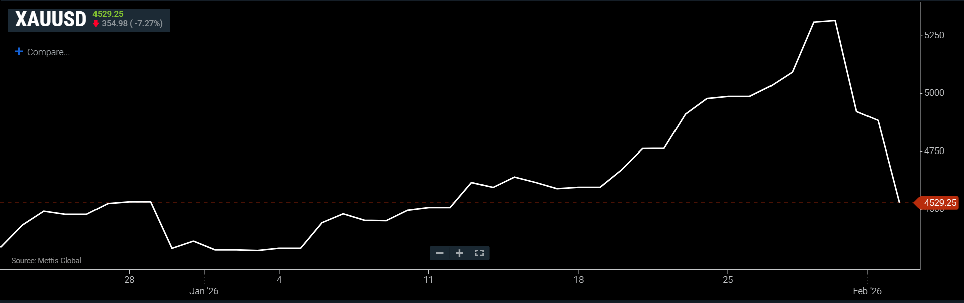 Spot gold fell 7.27% to $4529.25 an ounce as of [11:09 PM] PST, according to data reported by Mettis Global, after a 8% plunge that dragged bullion below the $5,000 threshold.