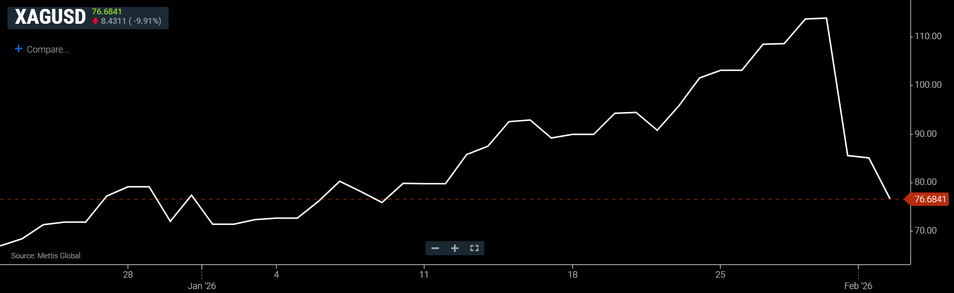 Silver mirrored the volatility, after climbing rapidly on safe-haven demand and speculative inflows, Spot silver fell 9.91% to $76.68 an ounce as of [11:09 PM] PST, according to data reported by Mettis Global.