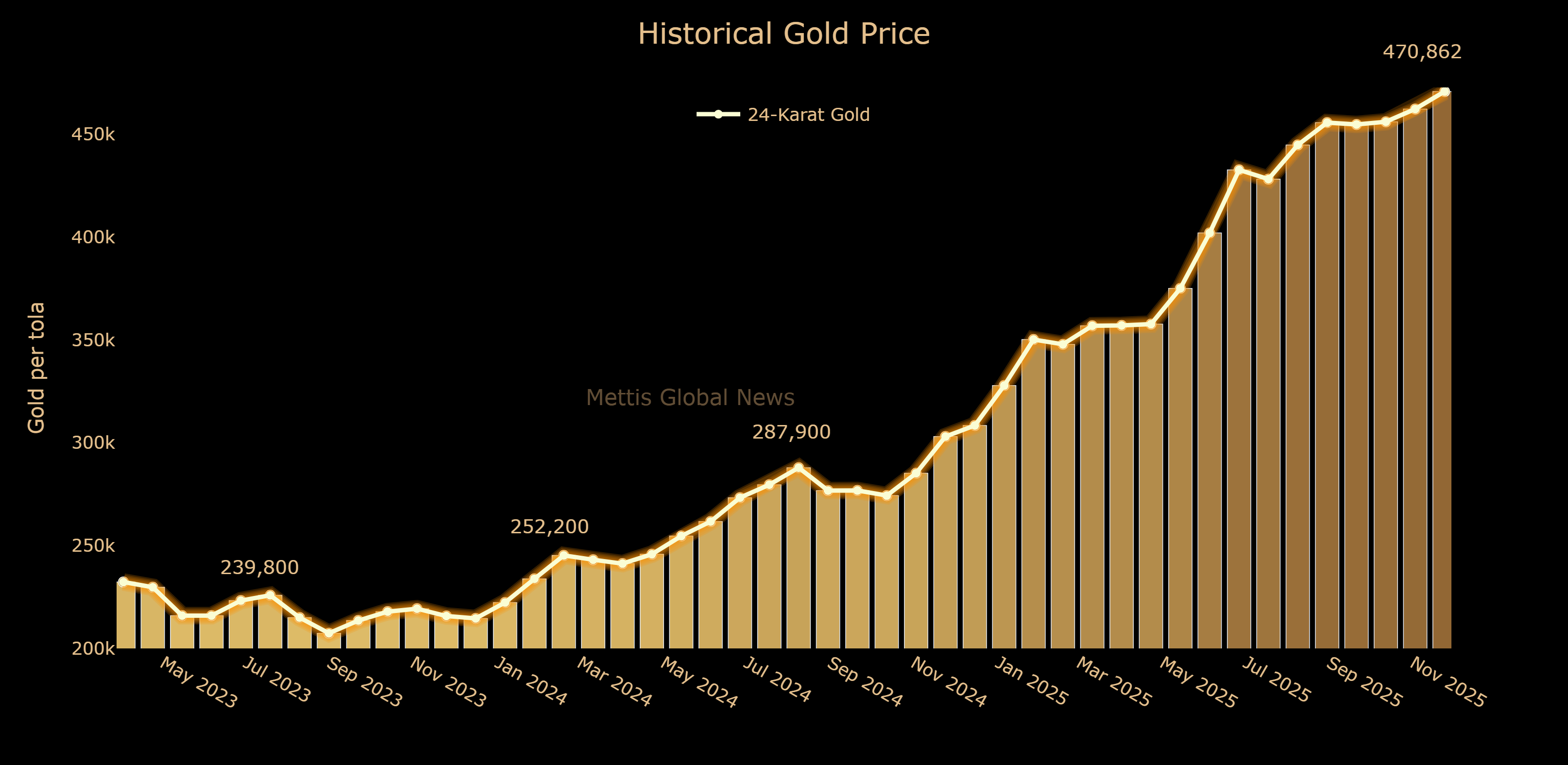 December 23, 2025 (MLN): Gold price in Pakistan increased on Tuesday, with 24-karat gold being sold at Rs470,862 per tola, up Rs8,500.
