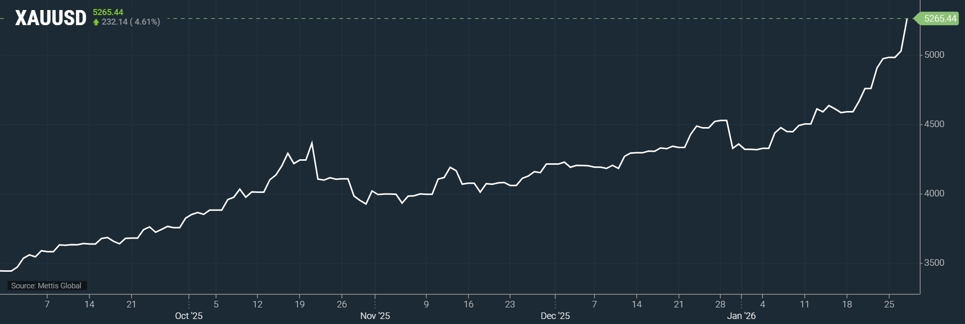 Spot gold rise 4.61% to $5,265 an ounce as of [11:56