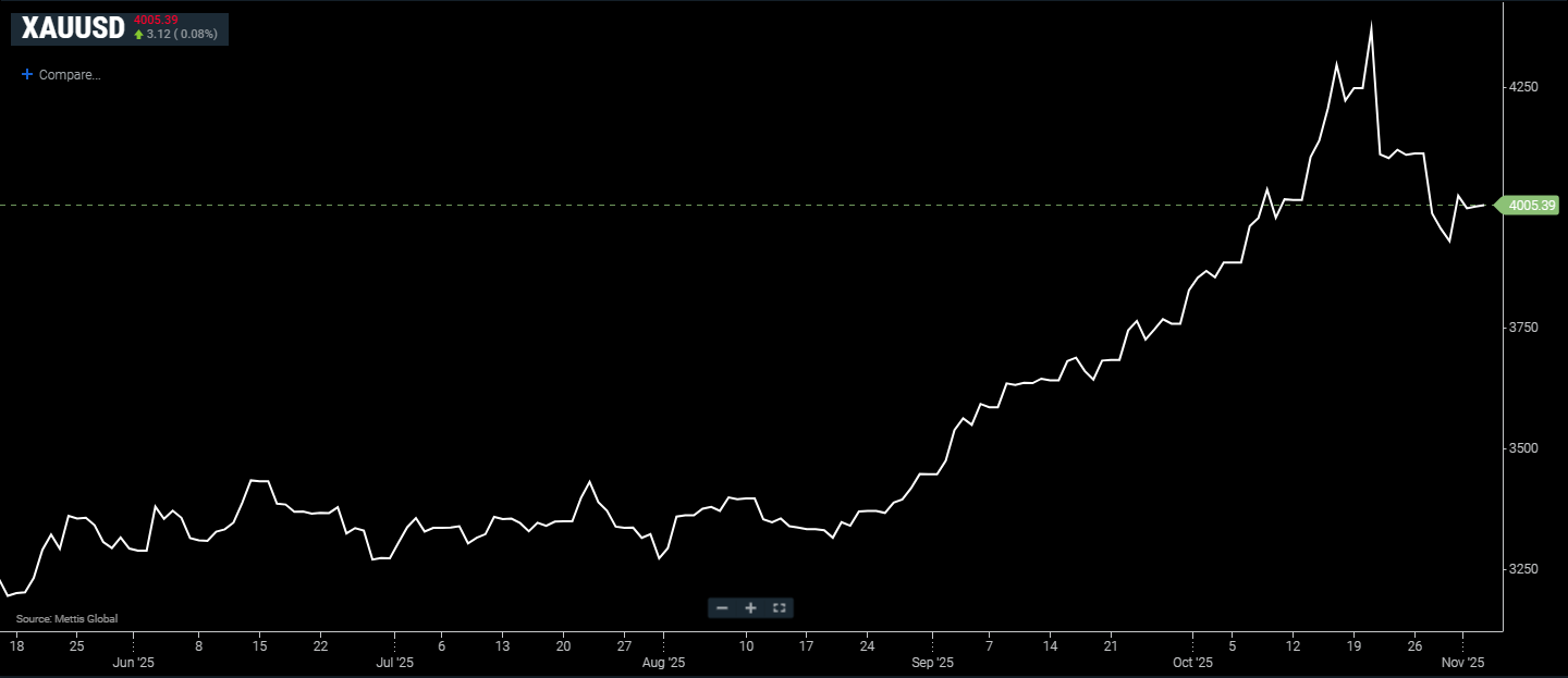 The metal has slid roughly 10% since reaching a record high of $4,381.21 on October 20, pressured by the dollar’s advance to a near three-month peak.