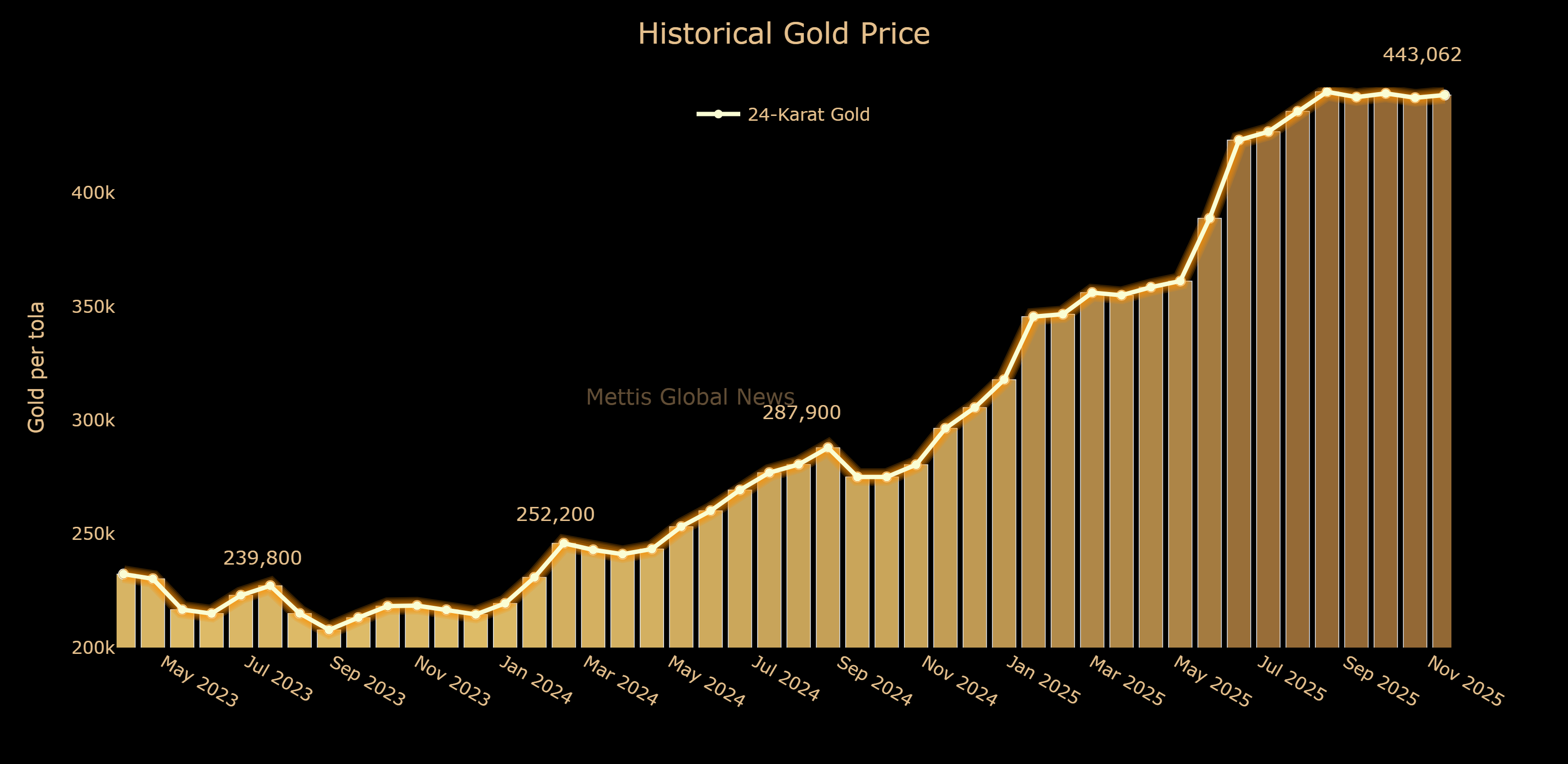 | PKR (24-karat per tola) | Dec 10, 2025 | Dec 09, 2025 | DoD | 1 Month | FYTD | CYTD |