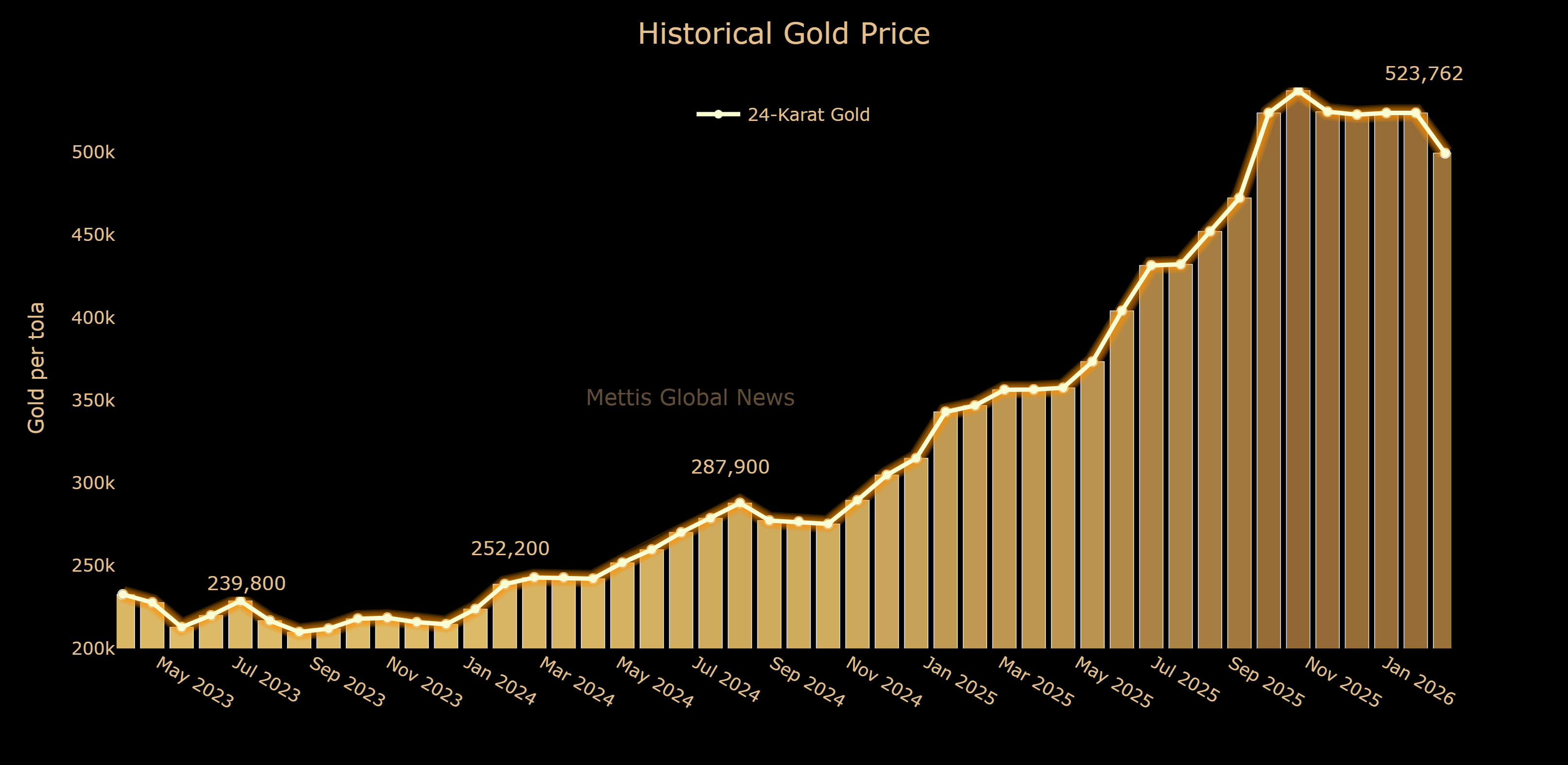 March 19, 2026 (MLN): Gold price in Pakistan decreased on Thursday, with 24-karat gold being sold at Rs499,462 per tola, down Rs24,300.