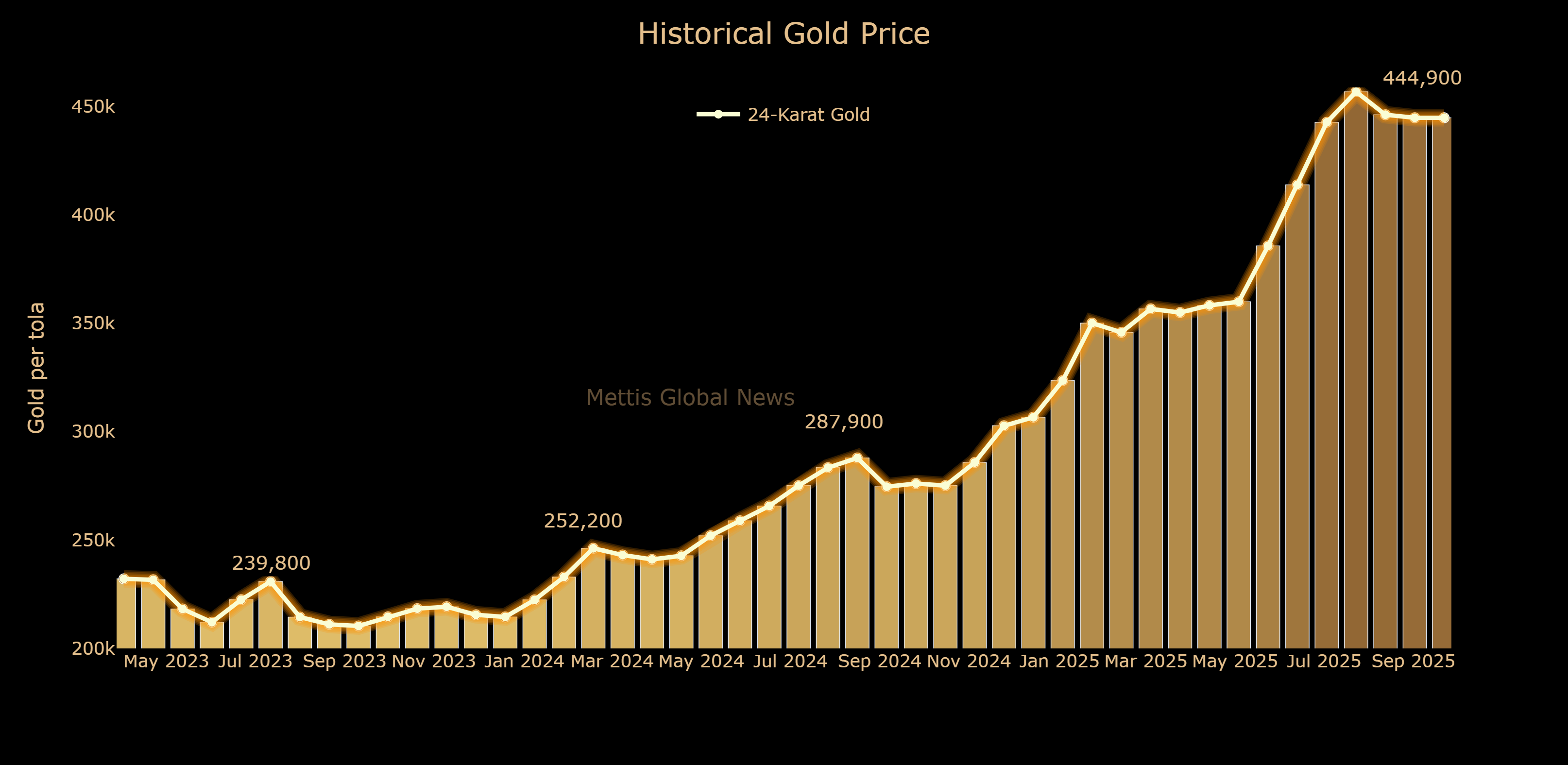 October 21, 2025 (MLN): Gold price in Pakistan remained unchanged on Tuesday, with 24-karat gold being sold at Rs444,900 per tola, unchanged from the previous session.