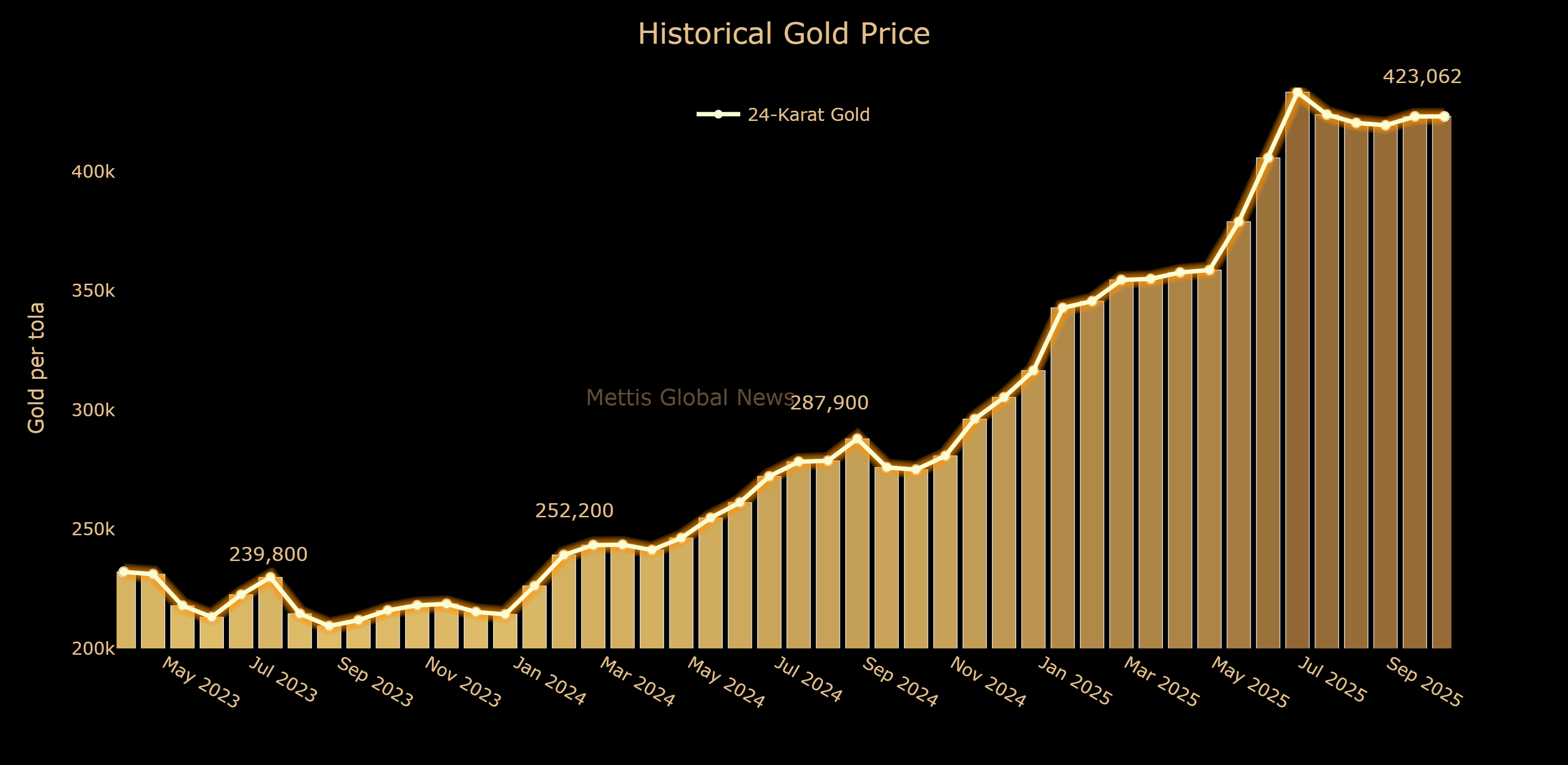 | PKR (24-karat per tola) | Nov 07, 2025 | Nov 06, 2025 | DoD | 1 Month | FYTD | CYTD |