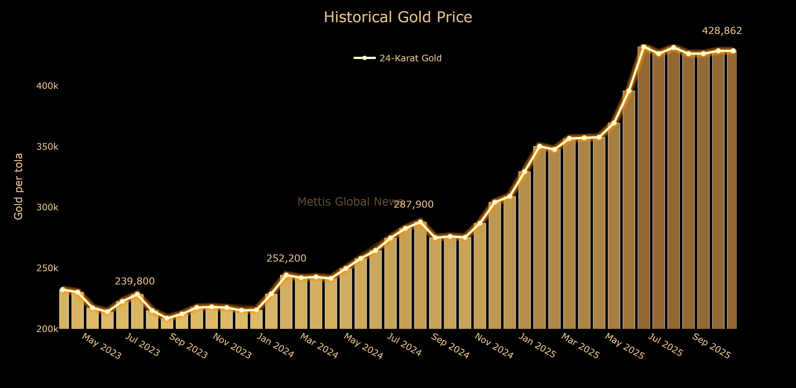 November 24, 2025 (MLN): Gold price in Pakistan remained unchanged on Monday, with 24-karat gold being sold at Rs428,862 per tola, unchanged from the previous session.