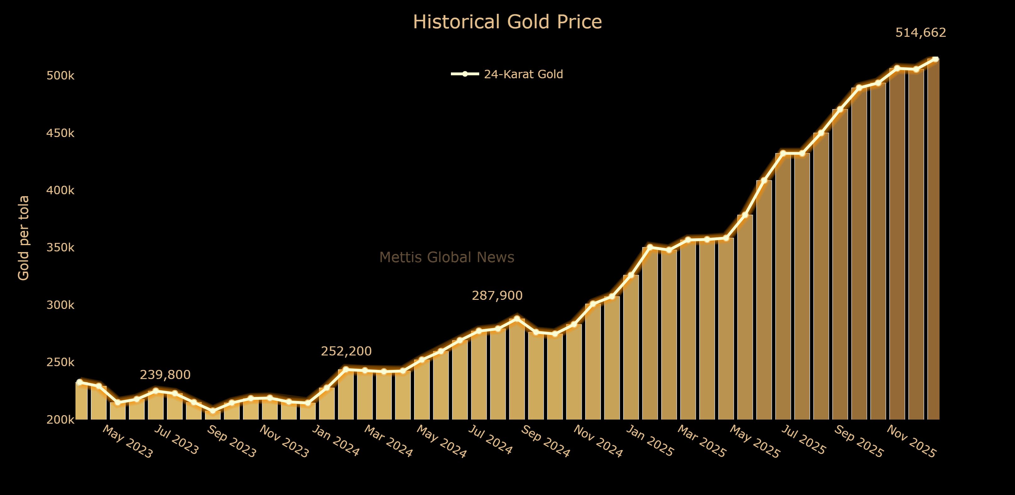 January 23, 2026 (MLN): Gold price in Pakistan increased on Friday, with 24-karat gold being sold at Rs514,662 per tola, up Rs9,100.