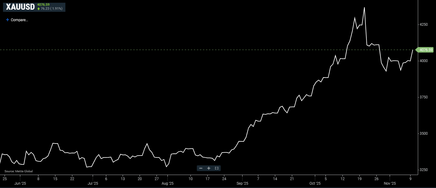 Spot gold rose 1.91% to $4,076.59 per ounce as of [12:00 pm] PST, according to data reported by Mettis Global.