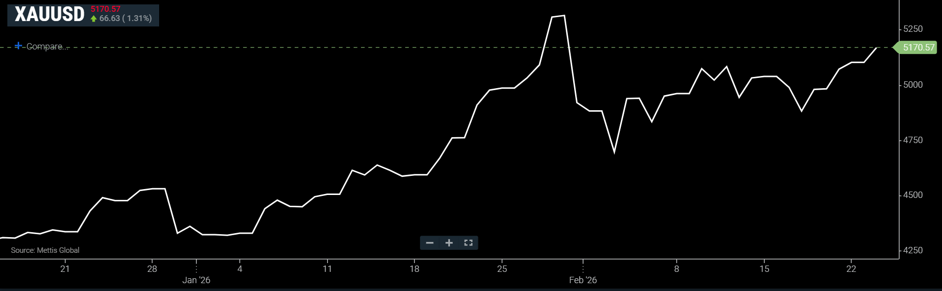 However, currently spot gold is up 1.31% to $5,170.57 an ounce as of [11:51 am] PST, according to data reported by Mettis Global.