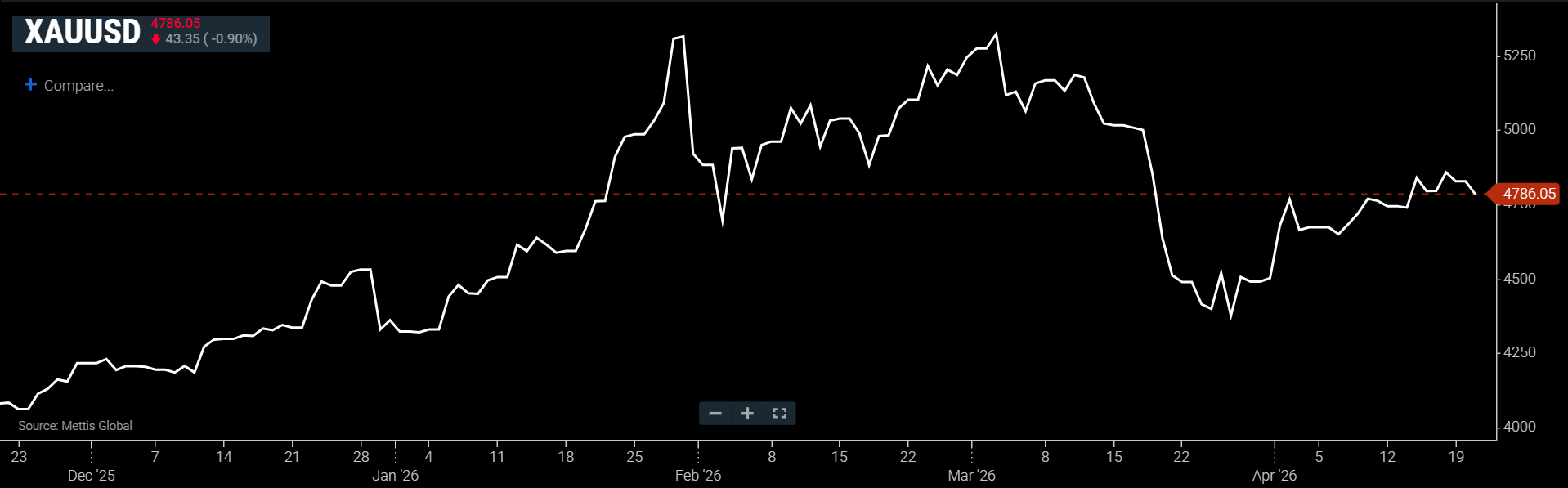 Currently, spot gold is down 0.9% to $4,786.05 an ounce as of [10:59 am] PST, according to data reported by Mettis Global.