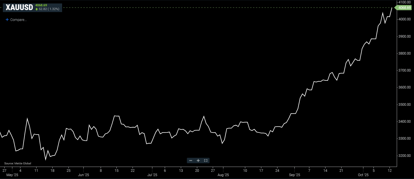 Spot gold was up 1.32%% at $4,068.69 an ounce as of [12:10 pm] PST, according to data reported by Mettis Global.
