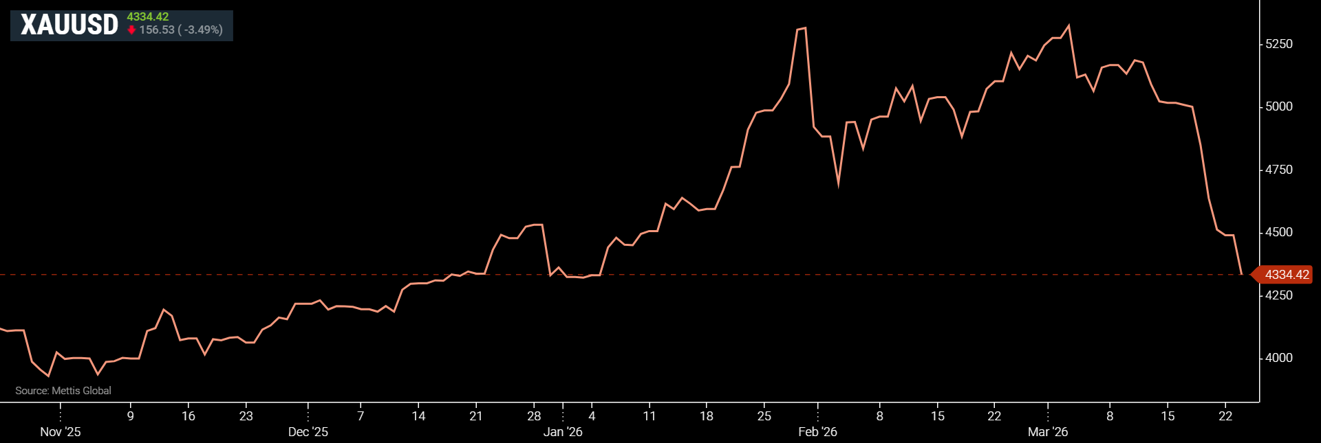 Currently, spot gold is down 3.49% to $4,334.42 an