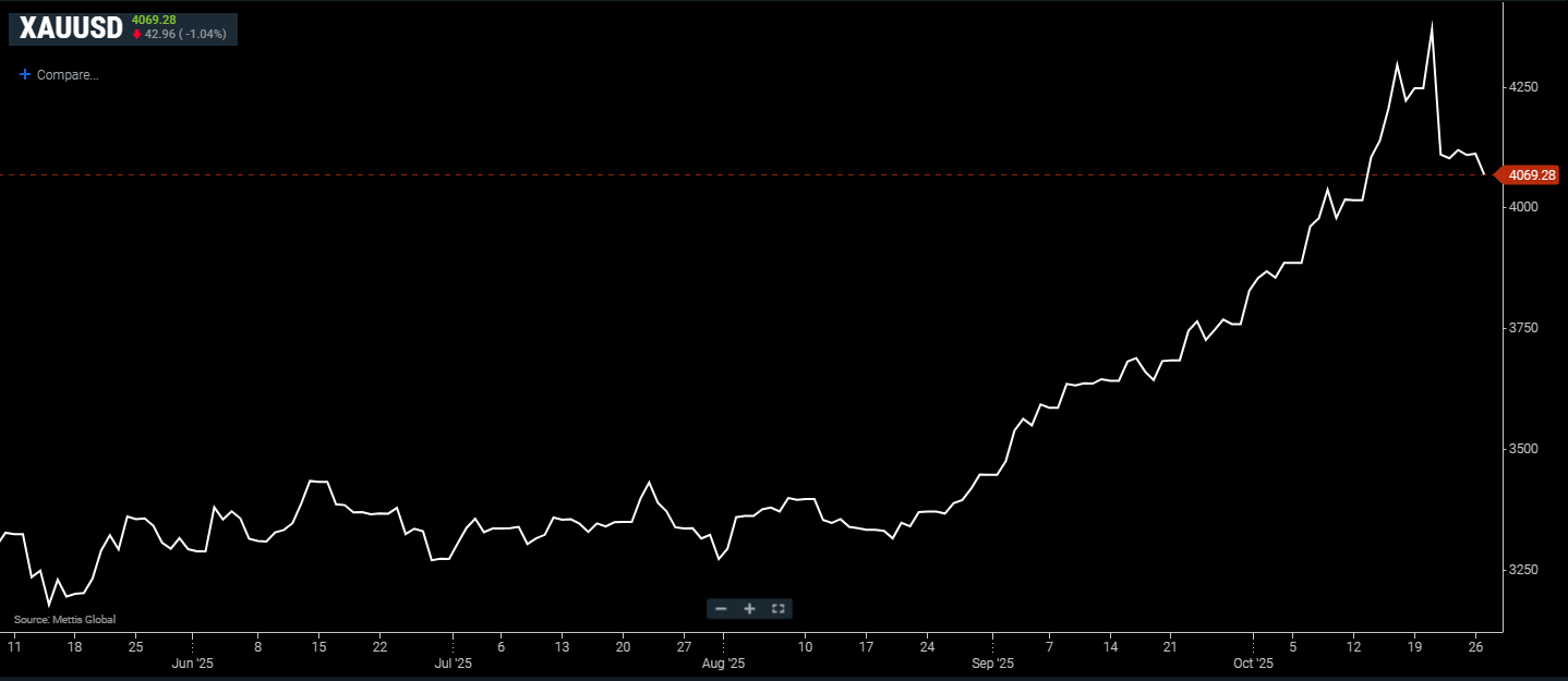 Spot gold was down 1.04% at $4,069.28 an ounce as of [12:48 pm] PST, according to data reported by Mettis Global.