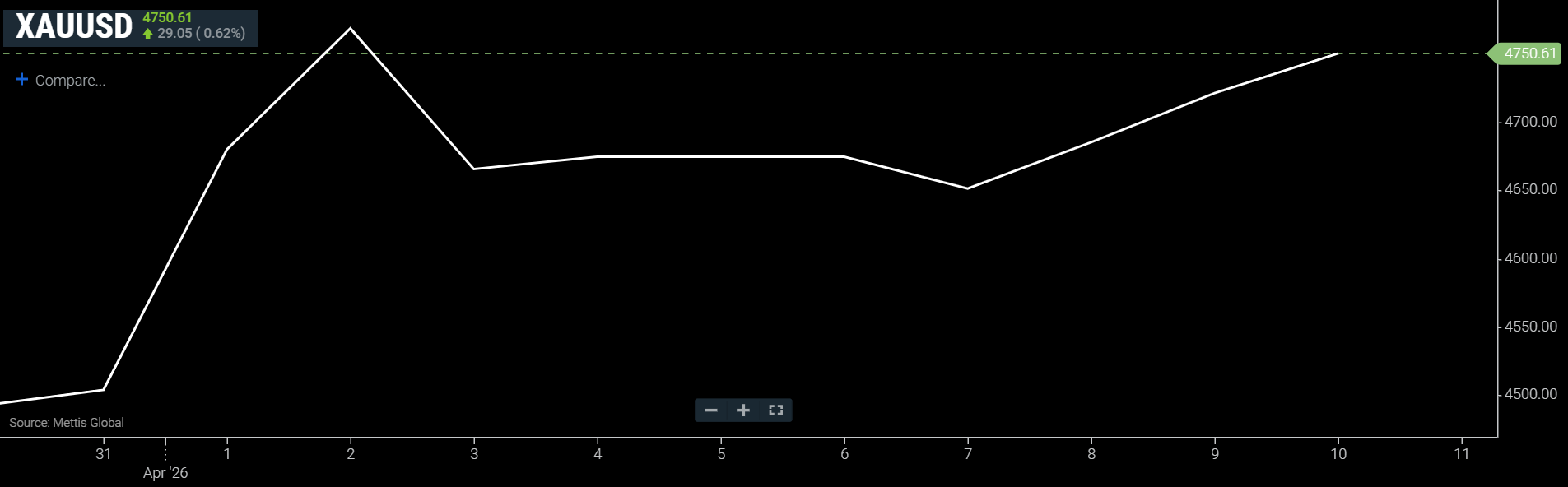 Currently, spot gold is up 0.62% to $4,750.61 an ounce as of [2:57 pm] PST, according to data reported by Mettis Global.