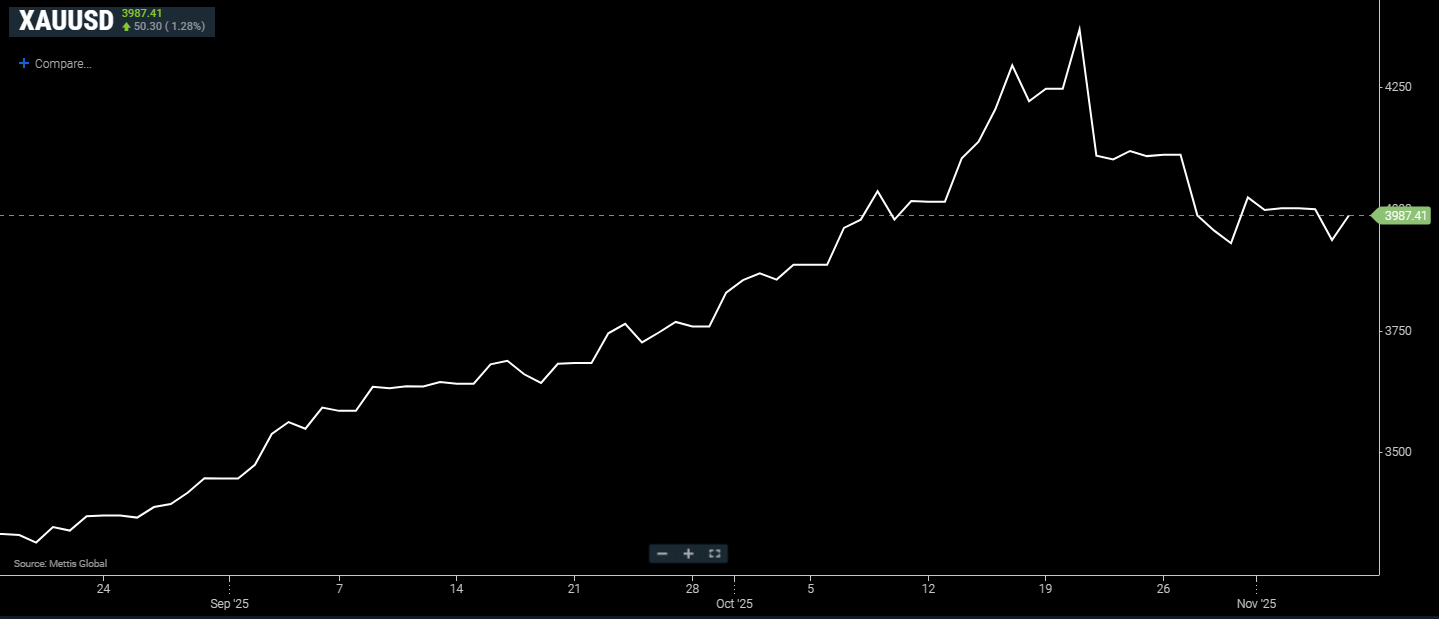 Spot gold was up 1.28% at $3,987.41 an ounce as of [11:02 am] PST, according to data reported by Mettis Global.