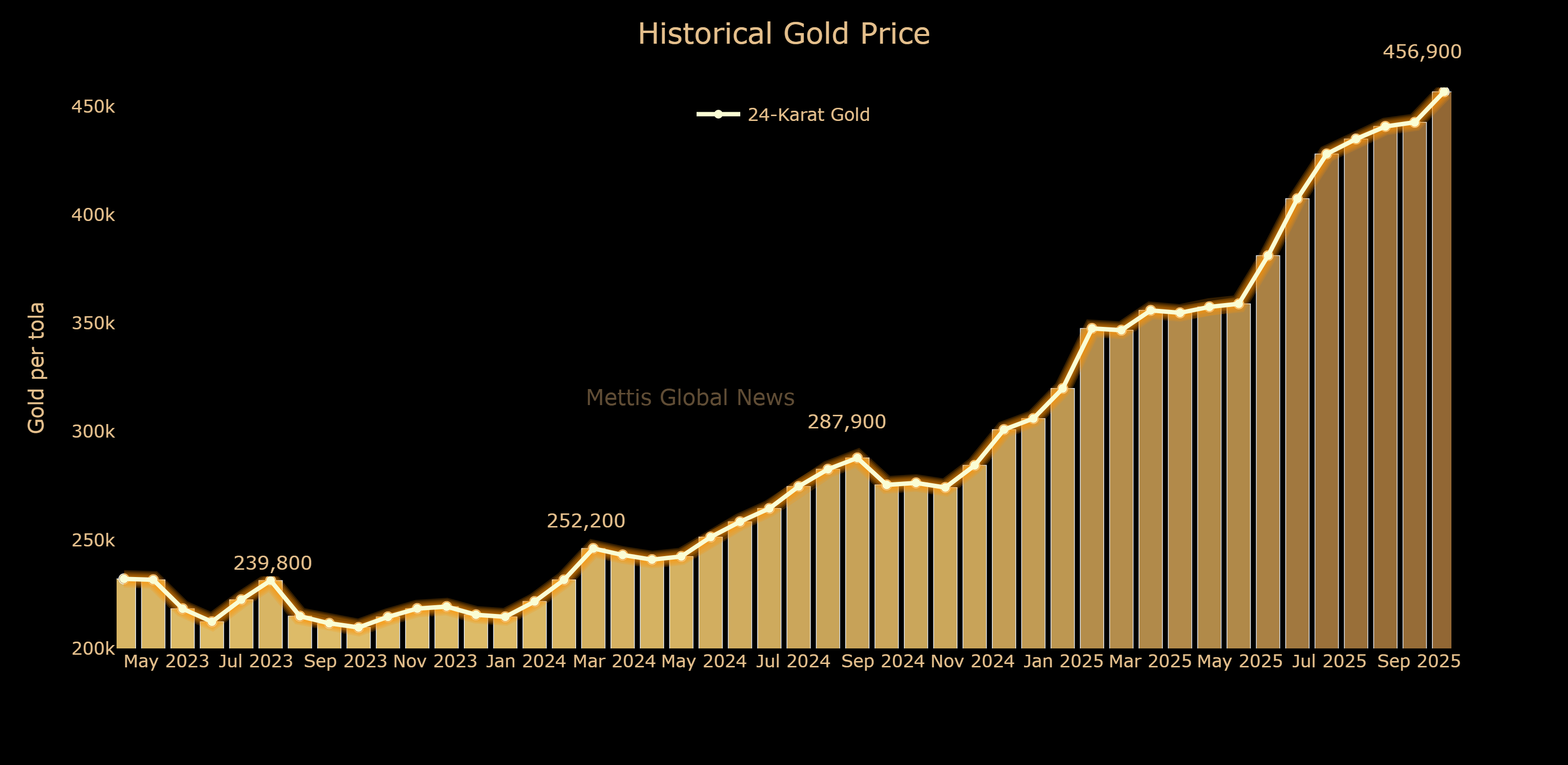 October 17, 2025 (MLN): Gold price in Pakistan increased on Friday, with 24-karat gold being sold at record high of Rs456,900 per tola, up Rs14,100.