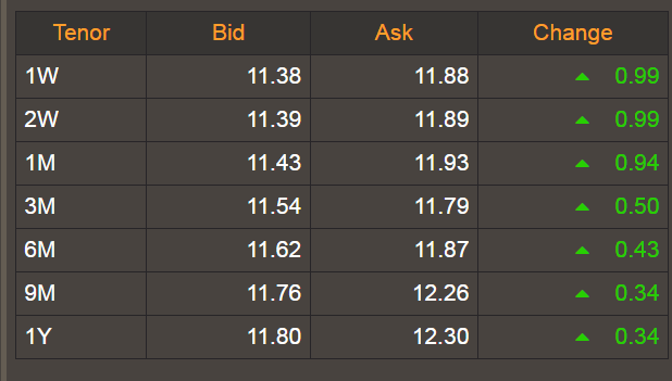 The 1-month tenor rose by 94 basis points, showing immediate