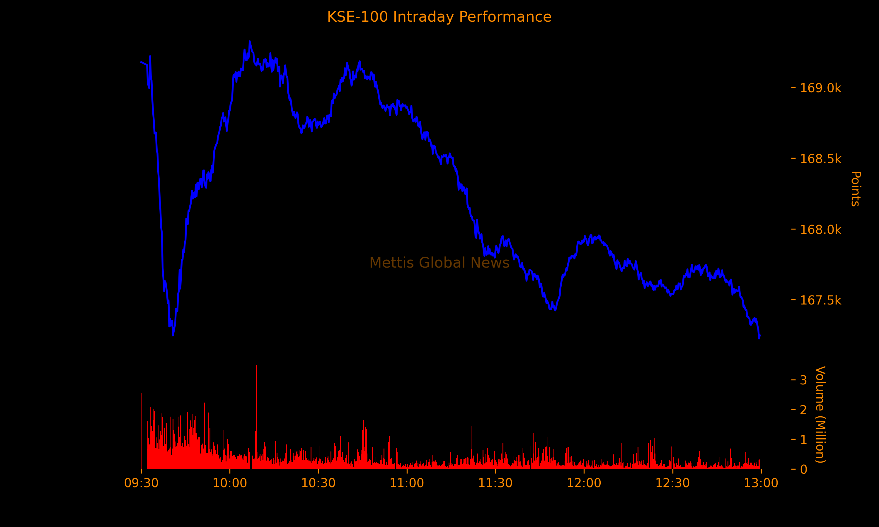 The index traded within a wide range of over 2,000 points, touching an intraday high of 169,326.35 and a low of 167,245.57, with total traded volume at 324.83 million shares so far.