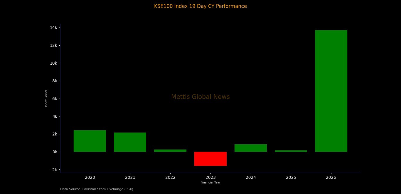 January 19, 2026 (MLN): The Pakistan Stock Exchange has delivered an extraordinary performance to start 2026, with the benchmark KSE-100 Index surging 13,707.37 points in just the first 19 trading days of the year marked the strongest opening rally in recent history.