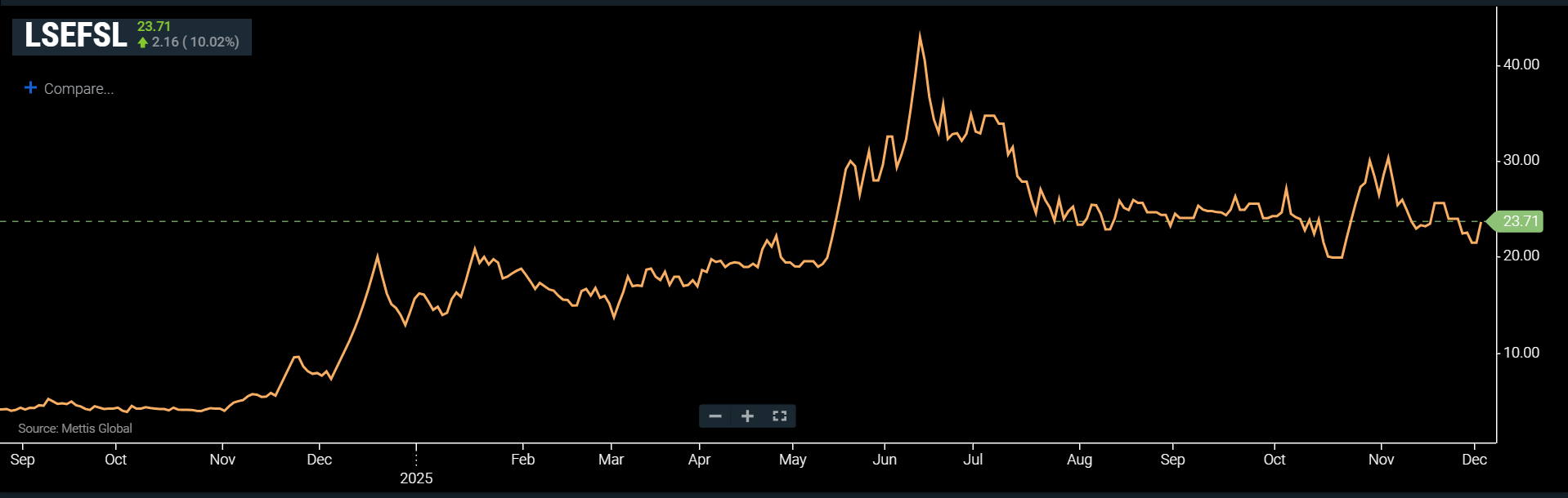 At the time of writing, the share of LSEFSL is being traded at Rs. 23.71, up Rs. 2.16 or 10.02%.