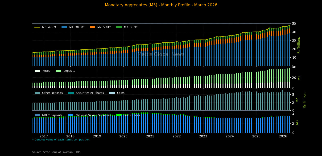 April 29, 2026 (MLN): The total money supply circulating in the economy stood at Rs47.69 trillion in March 2026, according to provisional data on Monetary Aggregates released by the State Bank of Pakistan (SBP).