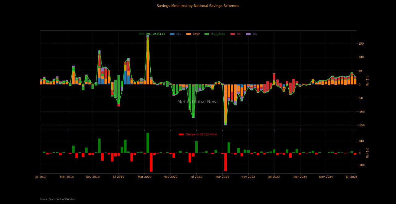 October 06, 2025 (MLN): The net receipts of Savings Mobilized by National Savings Schemes (NSS) stood at Rs29.34 billion in August as compared to receipts of Rs44.17bn in the previous month, the latest data issued by the State Bank of Pakistan (SBP) showed today.