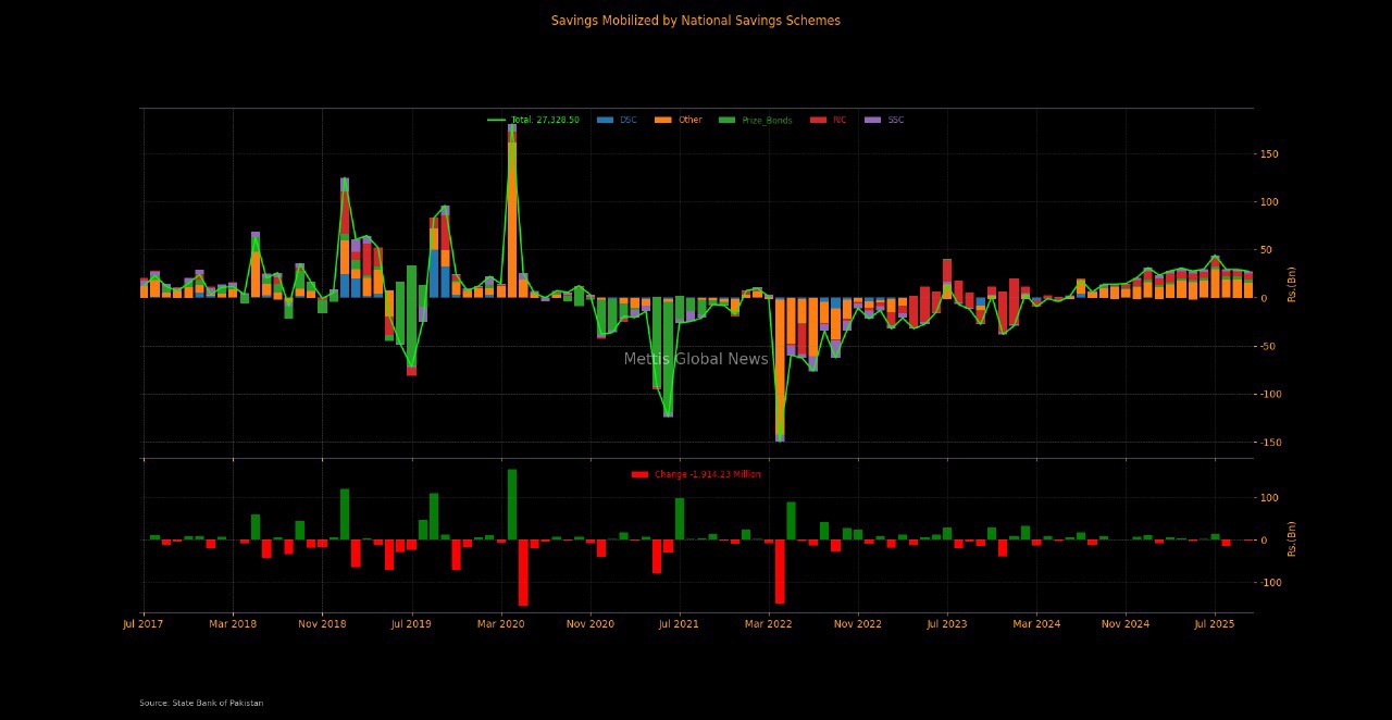 December 04, 2025 (MLN): Pakistan’s National Savings Schemes recorded net inflows of Rs27.3 billion in October 2025, supported primarily by renewed investor interest in Regular Income Certificates (RIC) and Special Savings Certificates (SSC), according to State Bank of Pakistan data.