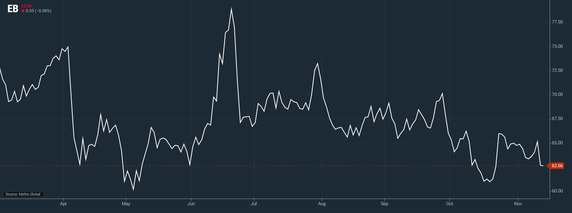 | BRENT CRUDE | 62.47 | 62.81 62.34 | -0.24 -0.38% |